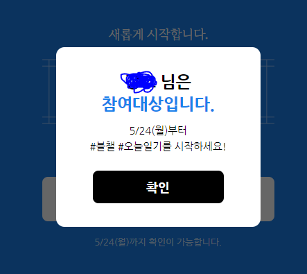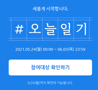 새롭게 시작합니다. #오늘일기 2021.05.24(월) 00:00 ~ 06.03(목) 23:59 참여대상 확인하기 5/24(월)까지 확인이 가능합니다.