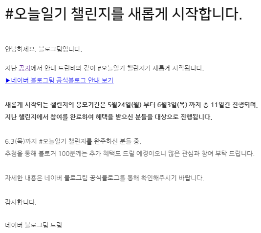 기존 취지를 살려 05월24(월) ~ 06월 13일(일) 11일 동안 #블챌 #오늘일기 챌린지를 다시 진행한다고 합니다.