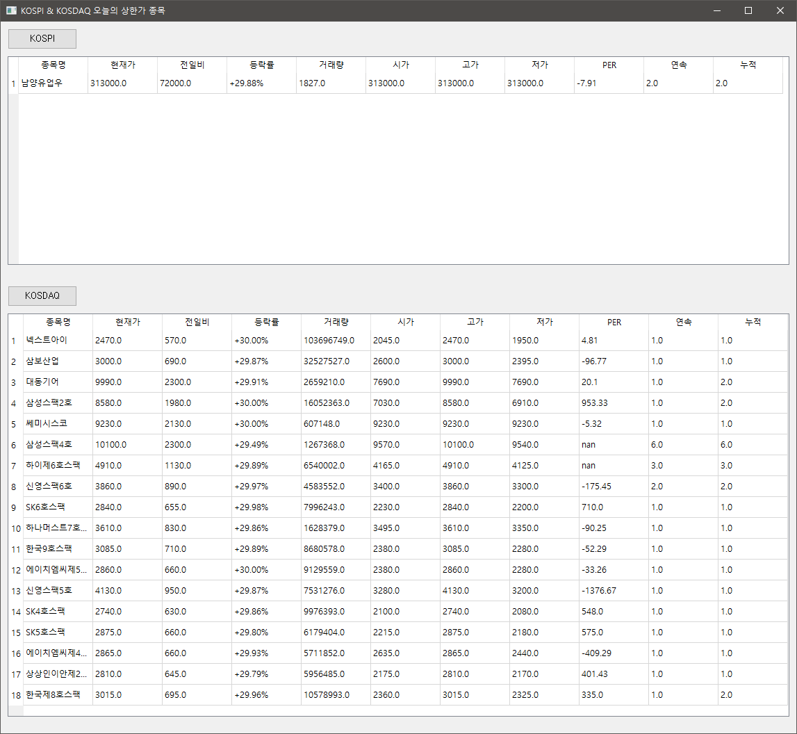 self.setWindowTitle("KOSPI & KOSDAQ 오늘의 상한가 종목")