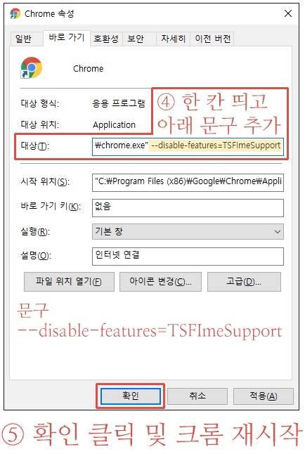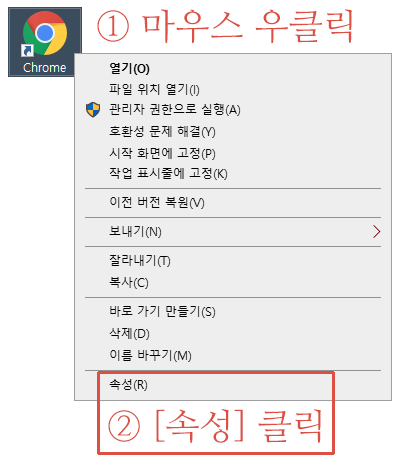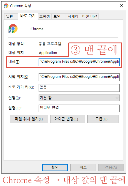 요약 : 구글크롬 바로가기 아이콘(우클릭)의 속성으로 들어가, [대상] 값 맨 끝에 아래 옵션을 추가