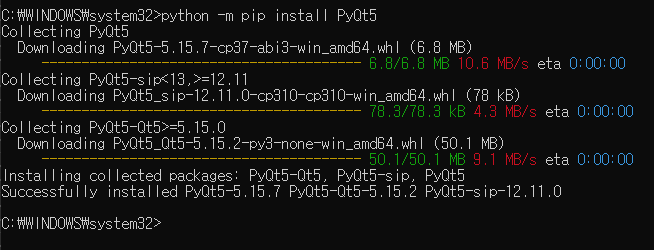 python -m pip install PyQt5 도 잘 설치되는 것을 볼 수 있다.