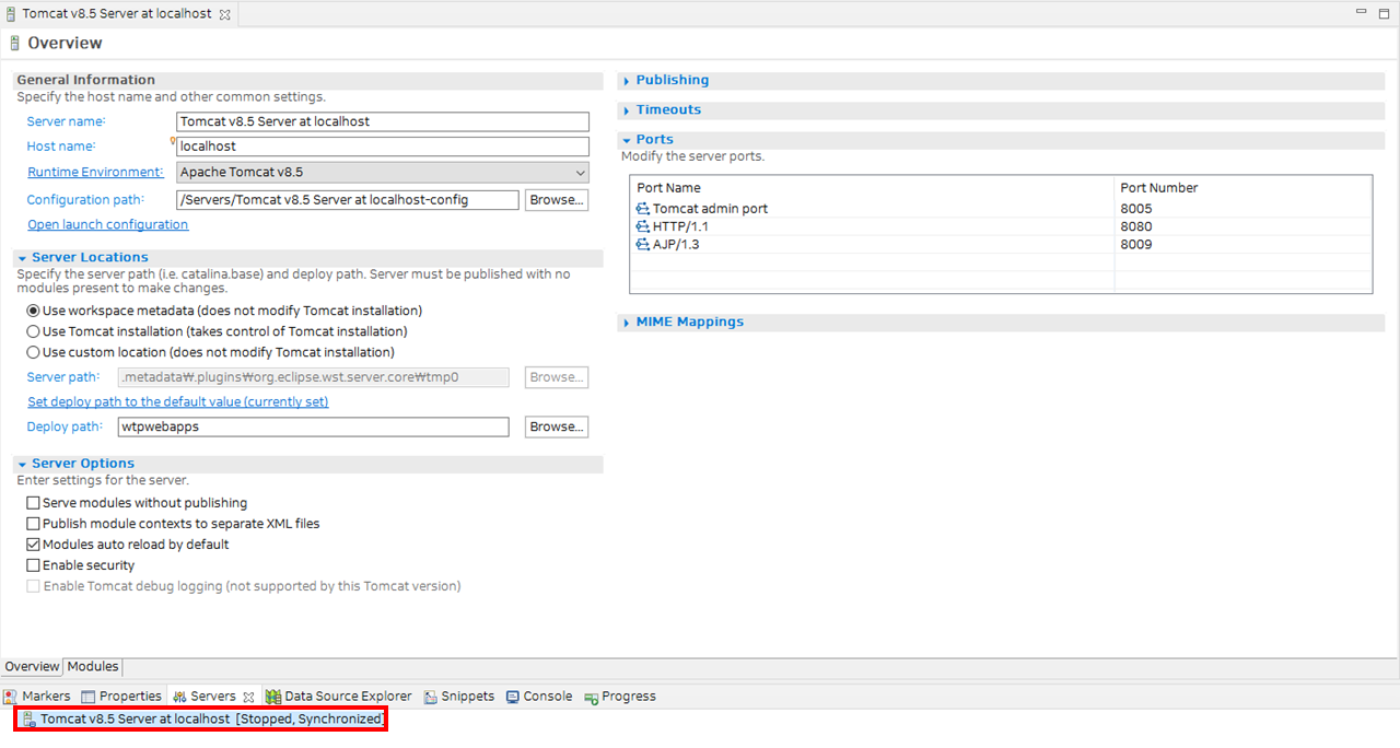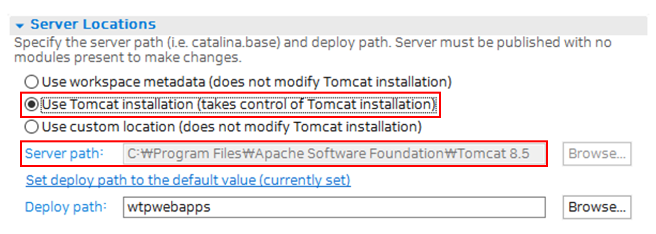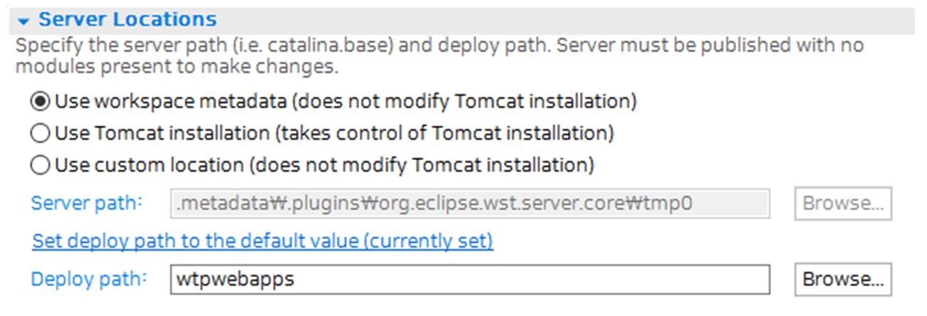 Server의 Locations를 workspace metadat에서 Tomcat installation 으로 변경해줍니다.