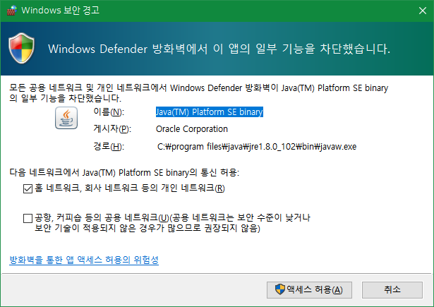 방화벽에서 해당 8080 포트 등을 열겠다는 경고창에서 "액세스 허용"을 클릭해줍니다.
