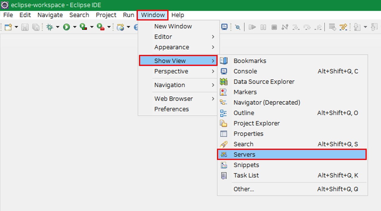 메뉴 > Window > Show View > Servers 로 서버 탭을 추가해줍니다.