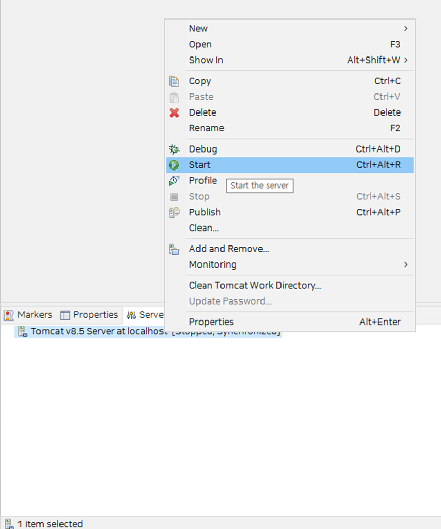 ④ 추가된 서버목록에서 우클릭하여 서버를 Start 해보겠습니다.