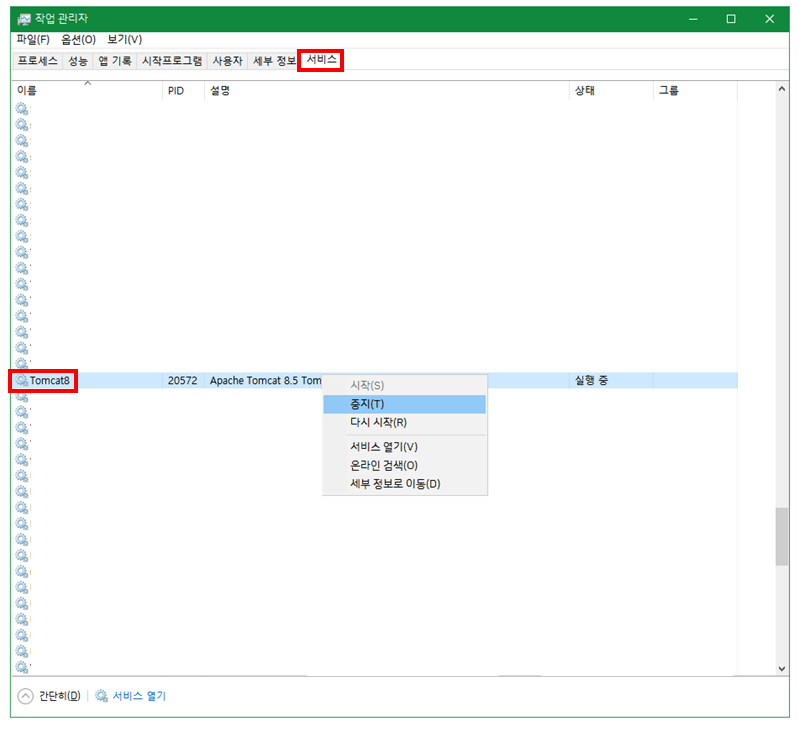 ⑥ 작업 관리자의 서비스 항목에서 "Tomcat" 서비스를 중지해줍니다.