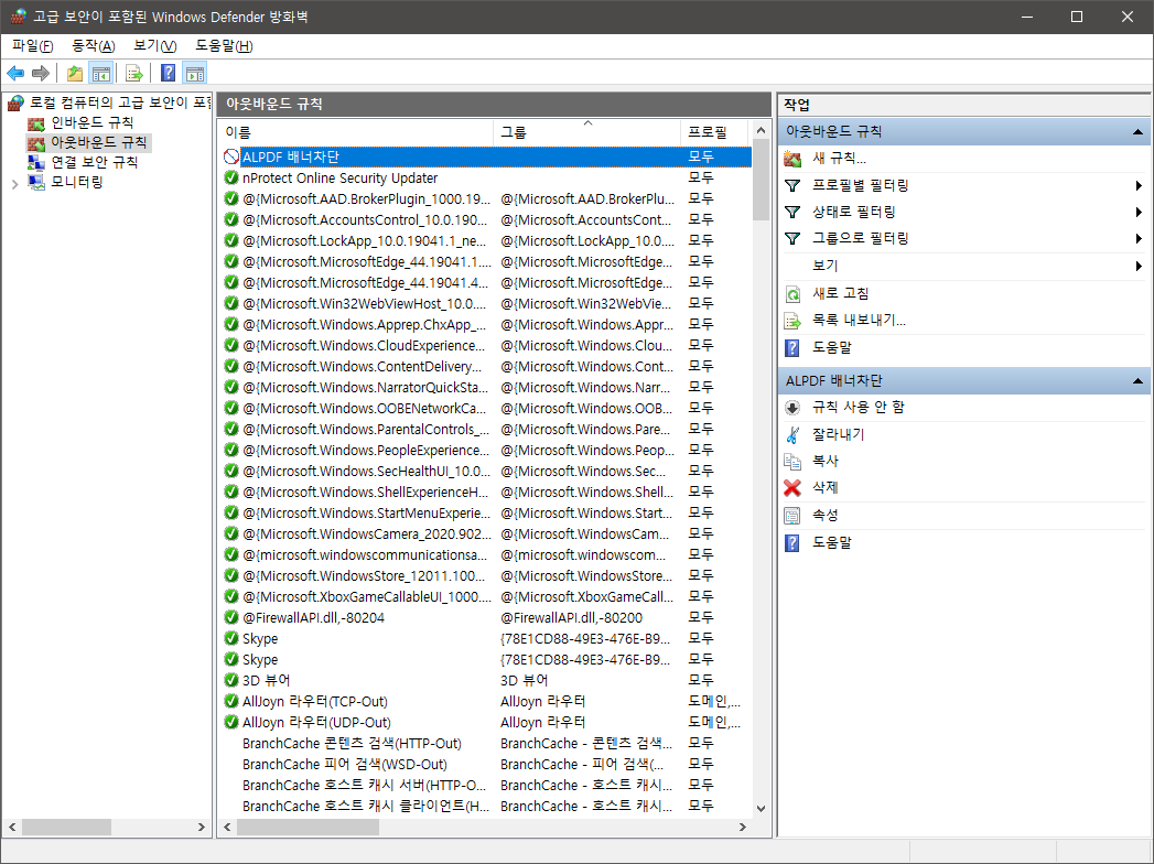 방화벽 -> 고급설정 -> 아웃바운드 규칙 -> ALPDF 프로그램 연결차단 등록
