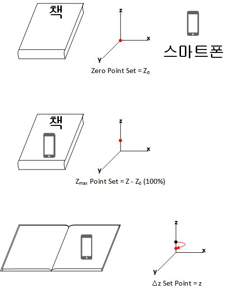 스마트폰의 z축 위치의 변화 값을 활용하여 책의 두께를 추론하는 방법을 생각했다.