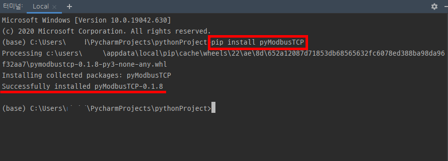 ③ 프롬프트 창에 pip install 'PyModbusTCP' 입력