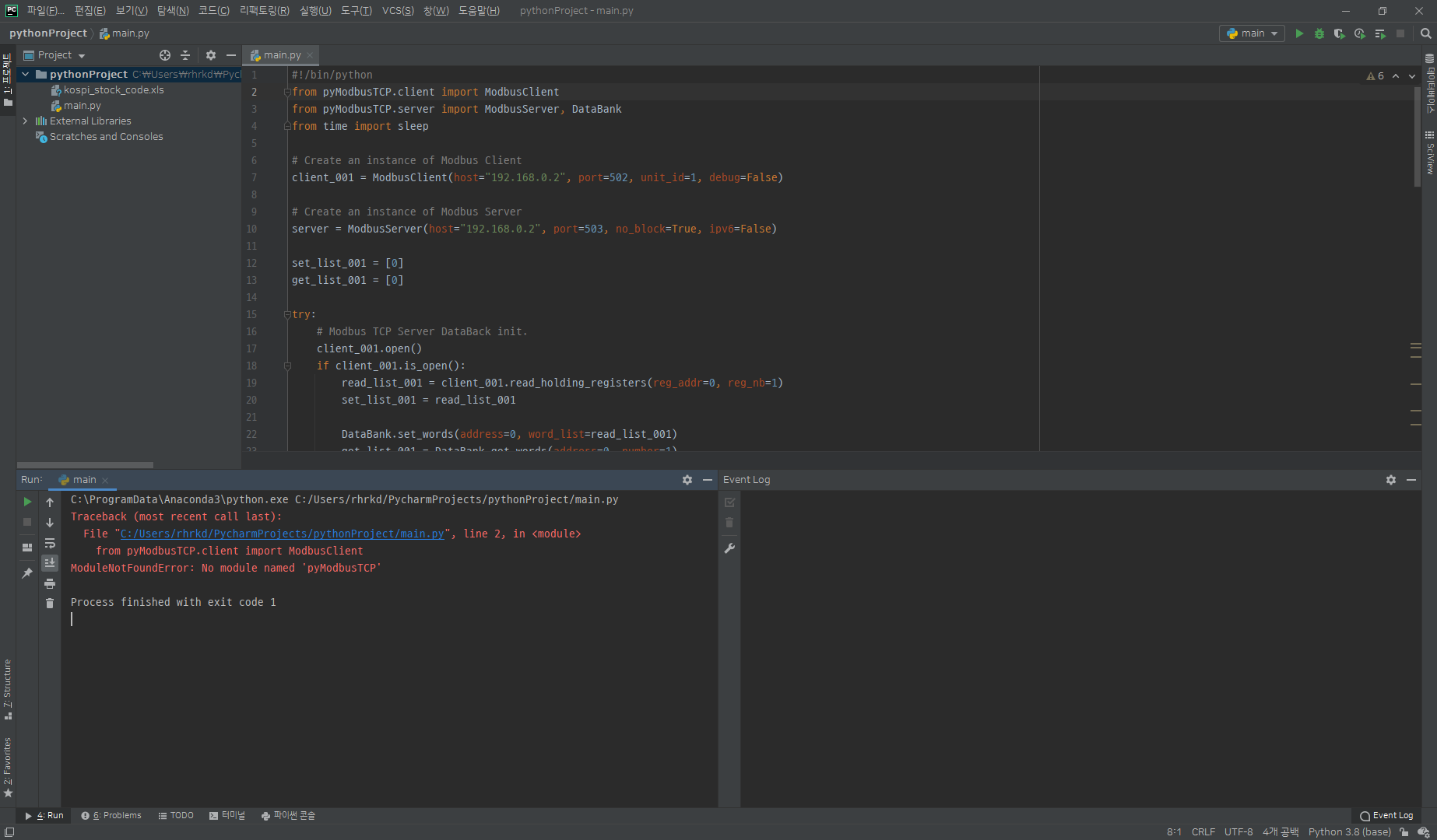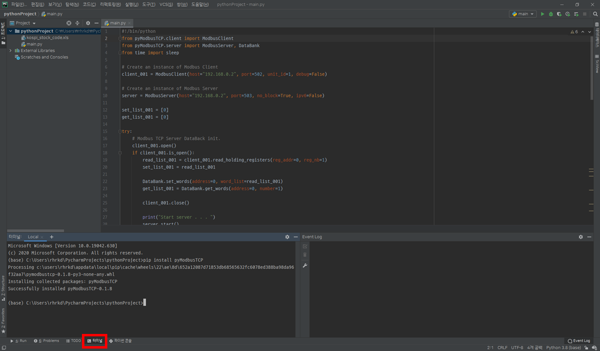 파이썬 환경에서 Modbus TCP/IP를 사용하기위한 라이브러리 Import를 하기 위한 방법입니다.